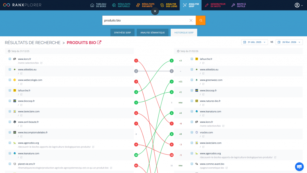 Sur Ranxplorer, il est possible d’analyser l’évolution de la SERP de vos expressions clés sur une période d’un an. En seulement 1 à 2 clics, vous repérerez facilement les sites qui sont les mieux référencés dans le top 50 de Google, ceux qui ont disparu de la SERP et les nouveaux sites qui ont fait leur apparition. Vous aurez donc toutes les informations essentielles pour affiner votre stratégie de contenu si nécessaire.