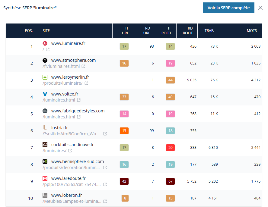 Pour vous préciser, les mots-clés liés sont aussi cliquables. Une fois que vous cliquez sur un d’entre eux, le générateur vous montre la SERP (page de résultats de recherche) pour examiner les 10 premiers sites et pages qui sont les mieux référencés sur ce dernier.