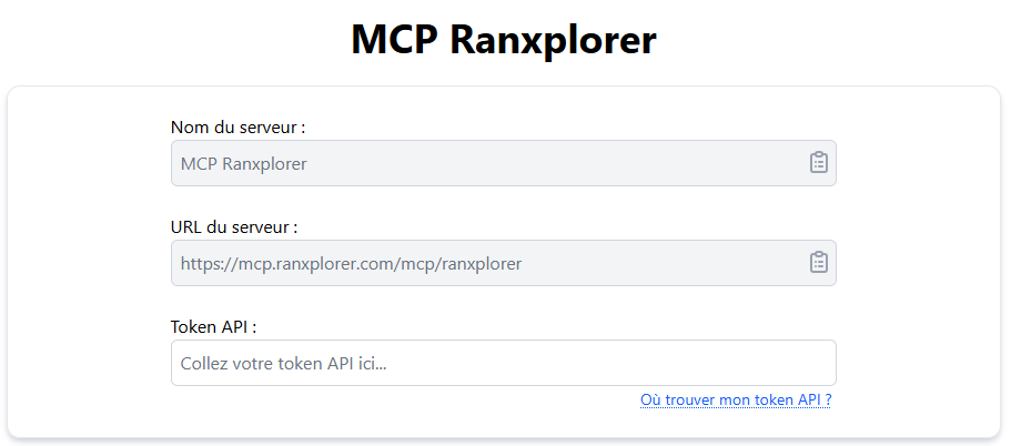 Prenons un cas simple : vous connectez vos données SEO issues de Ranxplorer (mots-clés, volumes, positions, tendances, concurrence, difficulté et netlinking) à un LLM via le serveur MCP de Ranxplorer, grâce à votre token API pour authentifier et accéder aux données.